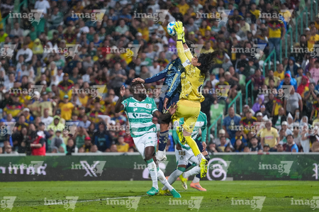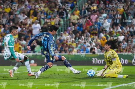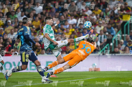 Torreón, Coahuila, 4 de abril de 2026. Lucas Di Yorio y Rodolfo Cota, durante el partido correspondiente a la jornada 13 del torneo Clausura 2026 de la Liga BBVA MX, entre los Guerreros de Santos Laguna y las Águilas del América, los Guerreros de Santos Laguna y las Águilas del América, realizado en el estadio Corona. Foto: Imago7/ Erick Saavedra