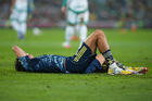 Torreón, Coahuila, 4 de abril de 2026. Miguel Vázquez resultó lesionado, durante el partido correspondiente a la jornada 13 del torneo Clausura 2026 de la Liga BBVA MX, entre los Guerreros de Santos Laguna y las Águilas del América, los Guerreros de Santos Laguna y las Águilas del América, realizado en el estadio Corona. Foto: Imago7/ Erick Saavedra