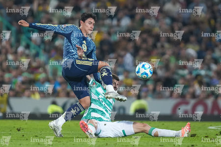Torreón, Coahuila, 4 de abril de 2026. Rodrigo Dourado y Javier Güemez, durante el partido correspondiente a la jornada 13 del torneo Clausura 2026 de la Liga BBVA MX, entre los Guerreros de Santos Laguna y las Águilas del América, los Guerreros de Santos Laguna y las Águilas del América, realizado en el estadio Corona. Foto: Imago7/ Erick Saavedra