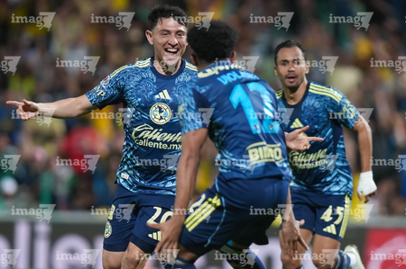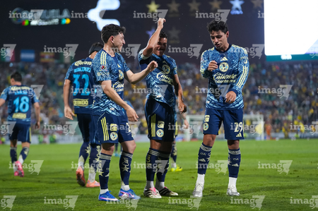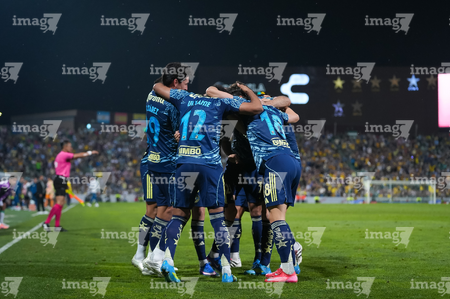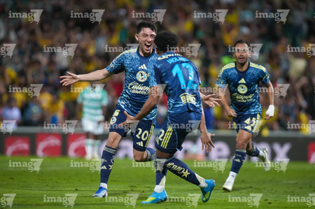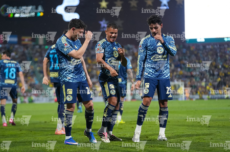 Torreón, Coahuila, 4 de abril de 2026. Alexis Gutiérrez, Jonathan Dos Santos y Ramón Juárez en festejo de gol, durante el partido correspondiente a la jornada 13 del torneo Clausura 2026 de la Liga BBVA MX, entre los Guerreros de Santos Laguna y las Águilas del América, los Guerreros de Santos Laguna y las Águilas del América, realizado en el estadio Corona. Foto: Imago7/ Erick Saavedra