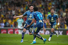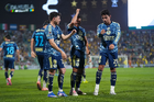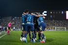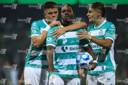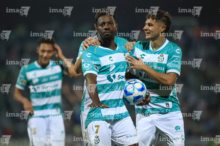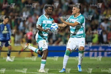 Torreón, Coahuila, 4 de abril de 2026. Tahiel Jiménez y Cristian Dajome en festejo de gol, durante el partido correspondiente a la jornada 13 del torneo Clausura 2026 de la Liga BBVA MX, entre los Guerreros de Santos Laguna y las Águilas del América, los Guerreros de Santos Laguna y las Águilas del América, realizado en el estadio Corona. Foto: Imago7/ Saul Perales