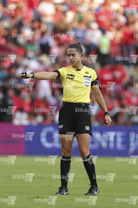 Querétaro, Querétaro, 4 de abril de 2026. Karenn Hernández Andrade, árbitro central, durante el partido correspondiente a la jornada 13 del torneo Clausura 2026 de la Liga BBVA MX, entre los Gallos Blancos del Querétaro y los Diablos Rojos del Toluca, realizado en el estadio La Corregidora. Foto: Imago7/ Rafael Vadillo