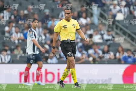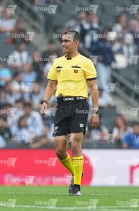 Guadalupe, Nuevo León, 4 de abril de 2026. Joaquín Alberto Vizcarra Armenta arbitro central durante el partido correspondiente a la jornada 13 del torneo Clausura 2026 de la Liga BBVA MX, entre los Rayados del Monterrey y el Atlético San Luis, realizado en el estadio BBVA. Foto: Imago7/