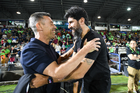 Ciudad Juárez, Chihuahua, 10 de abril de 2026. Pedro Caixinha y Washington Abreu, durante el partido correspondiente a la jornada 14 del torneo Clausura 2026 de la Liga BBVA MX, entre los Bravos de FC Juárez y los Xolos de Tijuana, realizado en realizado en el estadio Olímpico Benito Juárez. Foto: Imago7/ Alejandro Rodríguez