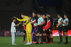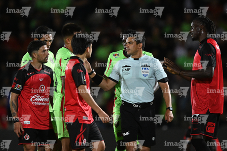 Ciudad Juárez, Chihuahua, 10 de abril de 2026. Jugadores en reclamo a Jorge Abraham Camacho, árbitro central, durante el partido correspondiente a la jornada 14 del torneo Clausura 2026 de la Liga BBVA MX, entre los Bravos de FC Juárez y los Xolos de Tijuana, realizado en realizado en el estadio Olímpico Benito Juárez. Foto: Imago7/ José Zamora