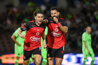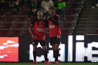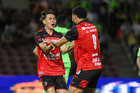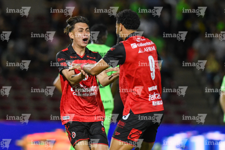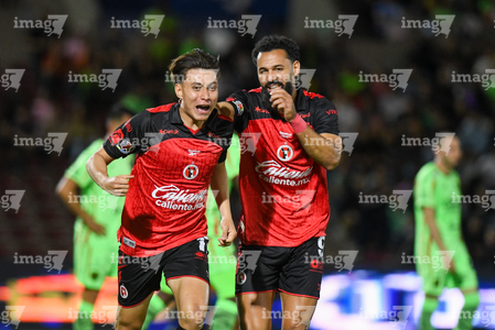 Ciudad Juárez, Chihuahua, 10 de abril de 2026. Ramiro Árciga y Mourad Daoudi en festejo de gol, durante el partido correspondiente a la jornada 14 del torneo Clausura 2026 de la Liga BBVA MX, entre los Bravos de FC Juárez y los Xolos de Tijuana, realizado en realizado en el estadio Olímpico Benito Juárez. Foto: Imago7/ Alejandro Rodríguez