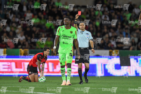 Ciudad Juárez, Chihuahua, 10 de abril de 2026. Jorge Abraham Camacho, muestra tarjeta de expulsión a Jesús Murillo, durante el partido correspondiente a la jornada 14 del torneo Clausura 2026 de la Liga BBVA MX, entre los Bravos de FC Juárez y los Xolos de Tijuana, realizado en realizado en el estadio Olímpico Benito Juárez. Foto: Imago7/ Alejandro Rodríguez