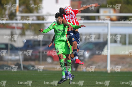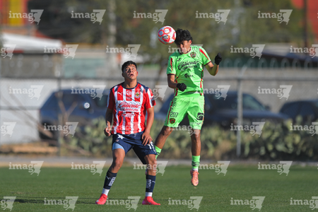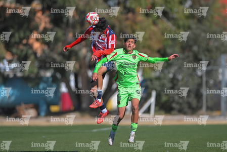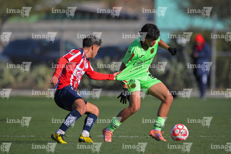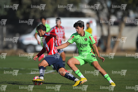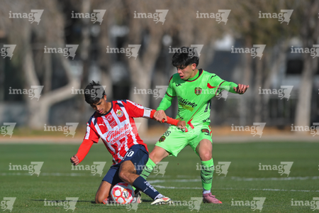 Ciudad Juárez, Chihuahua, 13 de enero de 2026. Leonardo Torres y Pablo Villanueva, durante el partido correspondiente a la jornada 2 del torneo clausura 2026 de la Liga BBVA MX categoría Sub21, entre los Bravos de FC Juárez y las Chivas Rayadas del Guadalajara, realizado en realizado en el Instituto Tecnológico de Ciudad Juárez. Foto: Imago7/ José Zamora