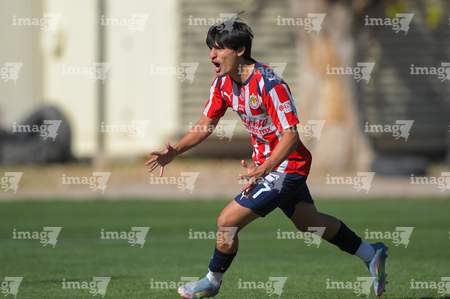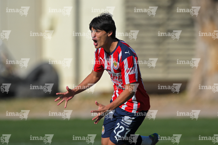 Ciudad Juárez, Chihuahua, 13 de enero de 2026. Carlos Zepeda en festejo de gol, durante el partido correspondiente a la jornada 2 del torneo clausura 2026 de la Liga BBVA MX categoría Sub21, entre los Bravos de FC Juárez y las Chivas Rayadas del Guadalajara, realizado en realizado en el Instituto Tecnológico de Ciudad Juárez. Foto: Imago7/ José Zamora