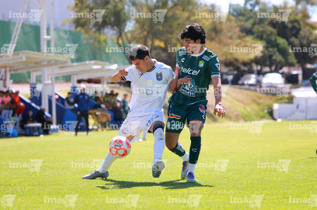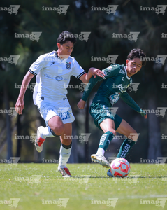 Querétaro, Querétaro, 07 de febrero 2026. Emiliano Guerrero y Donovan Suárez, durante el partido correspondiente a la jornada 5 del torneo Clausura 2026 de la Liga BBVA MX categoría Sub19, entre los Gallos Blancos del Querétaro y los Esmeraldas del León, realizado en el CEGAR. Foto: Imago7/