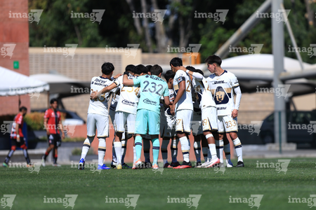 Guadalajara, Jalisco. 07 de febrero de 2026. Jugadores de Pumas sub19, durante el partido correspondiente a la jornada 5 del torneo Clausura 2026 de la Liga BBVA MX categoría Sub 19, entre los rojinegros del Atlas y los Pumas de la UNAM, realizado en la academia AGA. Foto/ Imago7/ Cristian Hernandez