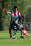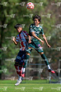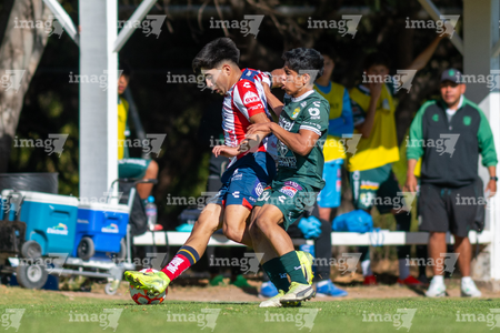 San Luis Potosí, San Luis Potosí, 21 de febrero de 2026. Juan Juárez y Juan Cuellar, durante el partido correspondiente a la jornada 7 del torneo Clausura 2026 de la Liga BBVA MX categoría Sub17, entre el Atlético San Luis y los Esmeraldas de León, realizado en La Presa. Foto: Imago7/