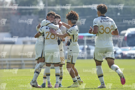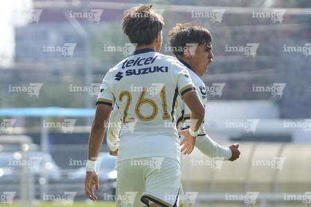 Ciudad de México a 14 de marzo de 2026. Jugadores de Pumas en festejo de gol, durante el partido correspondiente a la jornada 10 del torneo Clausura 2026 de la Liga BBVA MX categoría Sub 17, entre los Pumas de la UNAM y los Bravos del FC Juárez, realizado en Cantera. Foto: Imago7/ Carlos Vargas