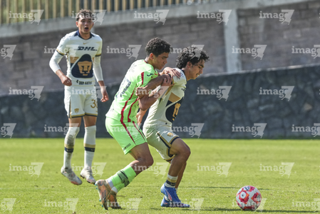 Ciudad de México a 14 de marzo de 2026. Adrián González y Nicolás Chacón, durante el partido correspondiente a la jornada 10 del torneo Clausura 2026 de la Liga BBVA MX categoría Sub 17, entre los Pumas de la UNAM y los Bravos del FC Juárez, realizado en Cantera. Foto: Imago7/ Carlos Vargas