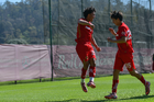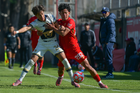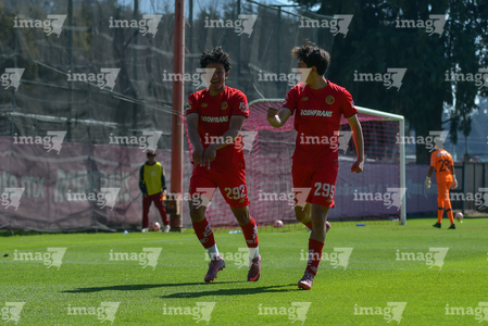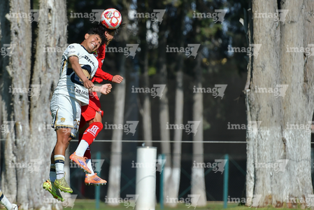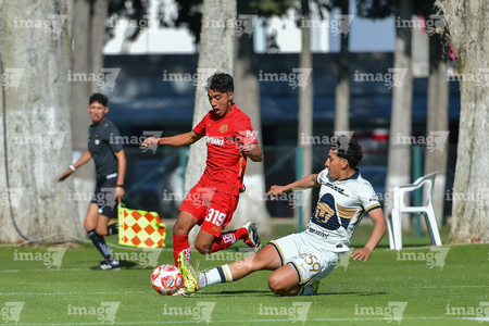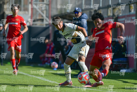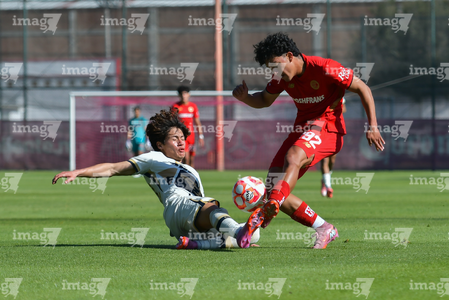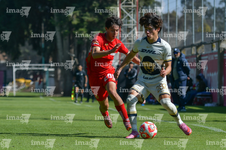 Metepec, Estado de México, 22 de marzo de 2026. Dariel Millán y Guillermo Niño, durante el partido correspondiente a la jornada 11 del torneo Clausura 2026 de la Liga BBVA MX categoría Sub17, entre los Diablos Rojos del Toluca y los Pumas de la UNAM, realizado en las instalaciones de Metepec. Foto: Imago7/ Arturo Hernández