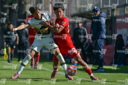 Metepec, Estado de México, 22 de marzo de 2026. José Huerta y Hector Martinez, durante el partido correspondiente a la jornada 11 del torneo Clausura 2026 de la Liga BBVA MX categoría Sub17, entre los Diablos Rojos del Toluca y los Pumas de la UNAM, realizado en las instalaciones de Metepec. Foto: Imago7/ Arturo Hernández