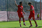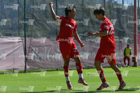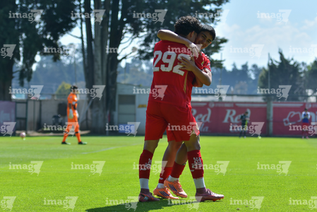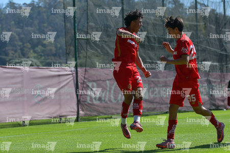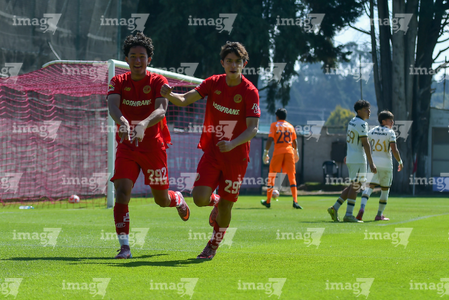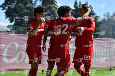 Metepec, Estado de México, 22 de marzo de 2026. Jugadores del Toluca en festejo de gol, durante el partido correspondiente a la jornada 11 del torneo Clausura 2026 de la Liga BBVA MX categoría Sub17, entre los Diablos Rojos del Toluca y los Pumas de la UNAM, realizado en las instalaciones de Metepec. Foto: Imago7/ Arturo Hernández