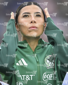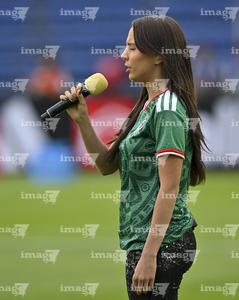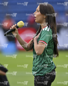 Ciudad de México, 7 de marzo de 2026. Charlyn Corral entona el himno nacional mexicano, durante el partido internacional de preparación, entre la Selección Nacional de México Femenil y la Selección de Brasil Femenil, realizado en el estadio Ciudad de los Deportes. Foto: Imago7/Diego Padilla