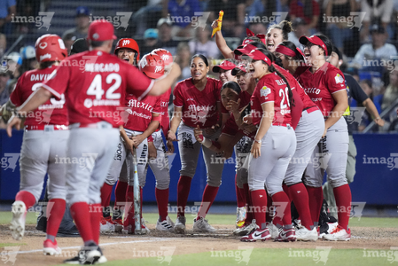 Monterrey, Nuevo León, 18 de marzo de 2025. Jugadoras de Diablos Rojos Softbol Femenil en festejo, durante el primer juego de la Serie de la Reina 2025 de la Liga Mexicana de Softbol, entre Sultanes de Monterrey Femenil y Diablos Rojos Femenil, celebrado en el estadio Mobil Super. Foto: Imago7/