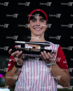 León, Guanajuato, 16 de febrero de 2026. Erika Piancastelli en festejo, durante el Home Run Derby del Juego de las Estrellas de la Liga Mexicana de Softbol, celebrado en el estadio Domingo Santana. Foto: Imago7/