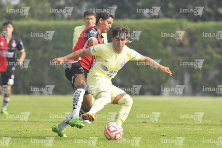 Guadalajara, Jalisco, 15 de octubre de 2022. José García y Kevin Esquivel, durante el partido de vuelta de las Semifinales del torneo Apertura 2022 de la Liga BBVA MX categoría Sub20, entre los Rojinegros del Atlas y las Águilas del América, celebrado en el CECAF. Foto: Imago7/ Sandra Bautista