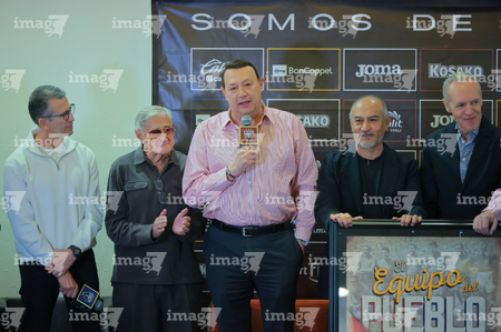 Ciudad de México, 17 de abril de 2025. Jorge Santillana, Emilio Escalante, Emilio Escalante García y personalidades fanáticas al club, durante la presentación del nuevo uniforme del Club Atlante, conmemorativo a su aniversario 109, la construcción de su centro de alto rendimiento y su película documental, realizada en el hotel Camino Real Pedregal. Foto: Imago7/ Eloisa Sánchez