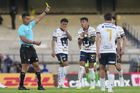 Ciudad de México, 12 de abril de 2025. Robert Ergas es amonestado, durante el partido correspondiente a la jornada 15 del torneo Clausura 2025 de la Liga BBVA MX, entre los Pumas de la UNAM y los Bravos de FC Juárez, realizado en el estadio Olímpico Universitario. Foto: Imago7/ Etzel Espinosa