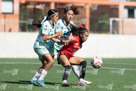 Guadalajara, Jalisco, 13 de abril de 2025. Jugadoras de Santos femenil, durante el partido correspondiente a la jornada 14 del torneo Clausura 2025 de la Liga BBVA MX Femenil categoría Sub19, entre las Rojinegras del Atlas y las Guerreras de Santos Laguna, realizado en la Academia AGA. Foto: Imago7/ Jair Terán