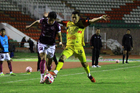 Zacatecas, Zacatecas, 11 de octubre de 2025. Víctor Barajas y Denilson Muñoz, durante el partido correspondiente a la jornada 11 del torneo Apertura 2025 de la Liga BBVA Expansión MX, entre los Mineros de Zacatecas y los Leones Negros de la UDG, realizado en el estadio Carlos Vega Villalba. Foto: Imago7/ Raúl Martínez