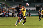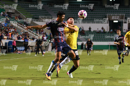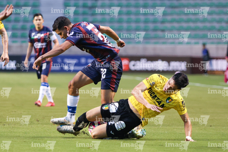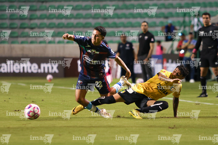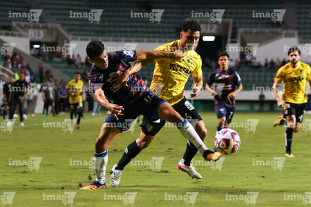 Zacatepec, Morelos, 18 de octubre de 2025. Néstor Vidrio y Maximiliano García, durante el partido correspondiente a la jornada 12 del torneo Apertura 2025 de la Liga BBVA Expansión MX, entre los Potros de Hierro del Atlante FC y los Venados de Merida, realizado en el estadio Agustín Coruco Díaz. Foto: Imago7/ Daniel Sydney