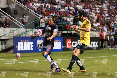 Zacatepec, Morelos, 18 de octubre de 2025. Arturo Delgado y Diego Cruz, durante el partido correspondiente a la jornada 12 del torneo Apertura 2025 de la Liga BBVA Expansión MX, entre los Potros de Hierro del Atlante FC y los Venados de Merida, realizado en el estadio Agustín Coruco Díaz. Foto: Imago7/ Daniel Sydney