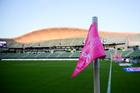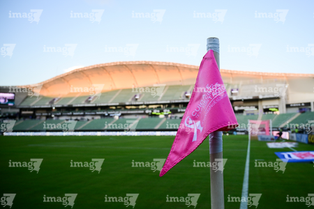 Mazatlán, Sinaloa, 3 de octubre de 2025. Banderín de tiro de esquina de la Campaña Rosa para la concientización del Cáncer de Mama, durante el partido correspondiente a la jornada 12 del torneo Apertura 2025 de la Liga BBVA MX, entre los Cañoneros del Mazatlán FC y el Atlético San Luis, realizado en El Encanto. Foto: Imago7/ Alexis Chávez