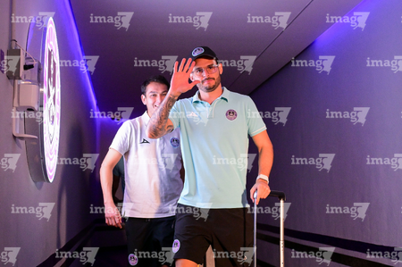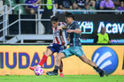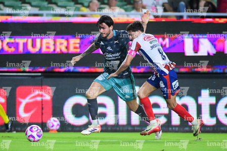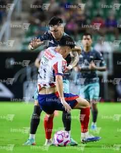 Mazatlán, Sinaloa, 3 de octubre de 2025. Nicolás Benedetti y Juan Sanabria, durante el partido correspondiente a la jornada 12 del torneo Apertura 2025 de la Liga BBVA MX, entre los Cañoneros del Mazatlán FC y el Atlético San Luis, realizado en El Encanto. Foto: Imago7/ Alexis Chávez