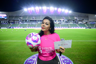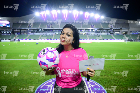 Mazatlán, Sinaloa, 3 de octubre de 2025. Embajadora de la Campaña Rosa para la concientización del Cáncer de Mama, durante el partido correspondiente a la jornada 12 del torneo Apertura 2025 de la Liga BBVA MX, entre los Cañoneros del Mazatlán FC y el Atlético San Luis, realizado en El Encanto. Foto: Imago7/ Alexis Chávez