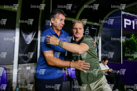 Mazatlán, Sinaloa, 3 de octubre de 2025. Robert Siboldi, director técnico y Guillermo Abascal, director técnico, durante el partido correspondiente a la jornada 12 del torneo Apertura 2025 de la Liga BBVA MX, entre los Cañoneros del Mazatlán FC y el Atlético San Luis, realizado en El Encanto. Foto: Imago7/ Alexis Chávez