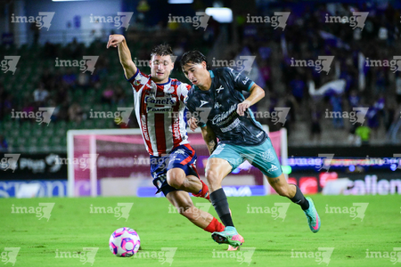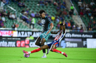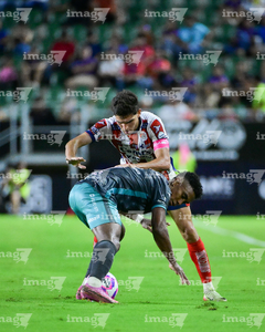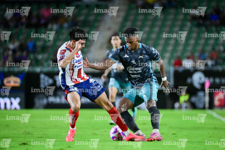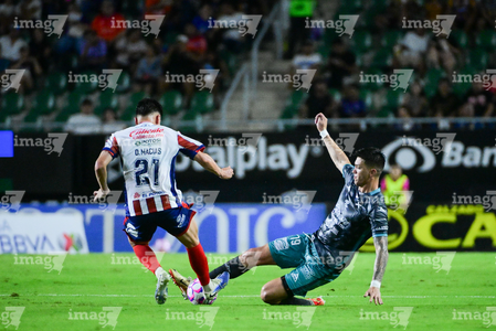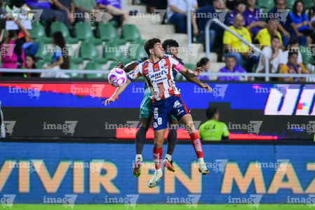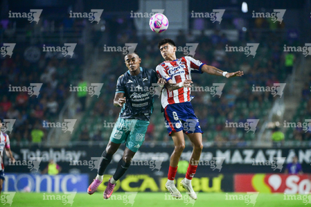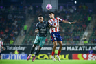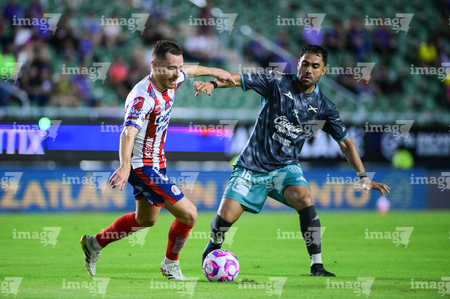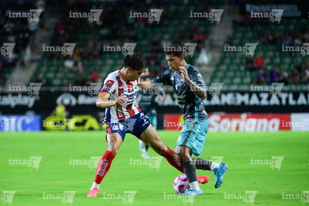 Mazatlán, Sinaloa, 3 de octubre de 2025. Sebastien Salles-lamonge y Joaquin Esquivel, durante el partido correspondiente a la jornada 12 del torneo Apertura 2025 de la Liga BBVA MX, entre los Cañoneros del Mazatlán FC y el Atlético San Luis, realizado en El Encanto. Foto: Imago7/ Alexis Chávez
