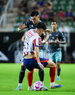 Mazatlán, Sinaloa, 3 de octubre de 2025. Román Torres y , durante el partido correspondiente a la jornada 12 del torneo Apertura 2025 de la Liga BBVA MX, entre los Cañoneros del Mazatlán FC y el Atlético San Luis, realizado en El Encanto. Foto: Imago7/ Alexis Chávez