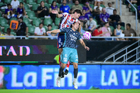 Mazatlán, Sinaloa, 3 de octubre de 2025. Mateo Klimowicz y Mauro Lainez, durante el partido correspondiente a la jornada 12 del torneo Apertura 2025 de la Liga BBVA MX, entre los Cañoneros del Mazatlán FC y el Atlético San Luis, realizado en El Encanto. Foto: Imago7/ Alexis Chávez