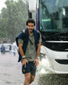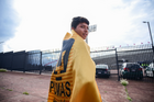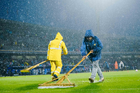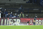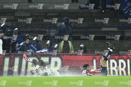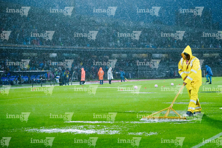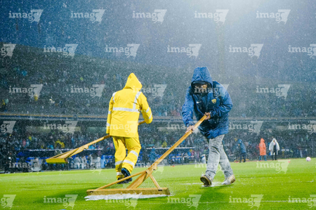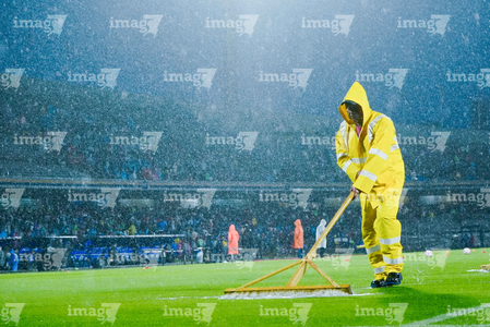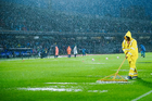 Ciudad de México, 5 de octubre de 2025. Trabjadores sacan agua del Terreno de Juego, durante el partido correspondiente a la jornada 12 del torneo Apertura 2025 de la Liga BBVA MX, entre los Pumas de la UNAM y las Chivas Rayadas del Guadalajara, realizado en el estadio Olímpico Universitario. Foto: Imago7/ Diego Padilla
