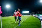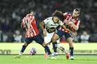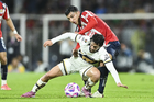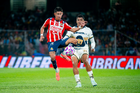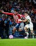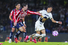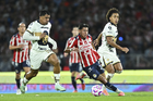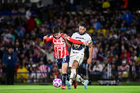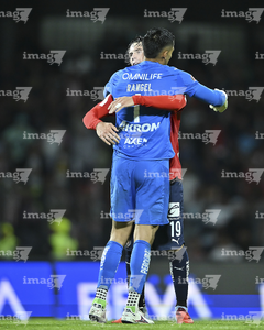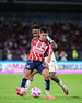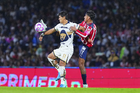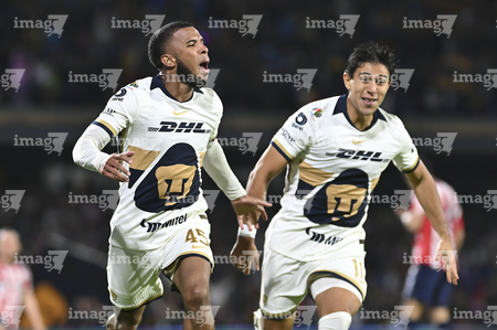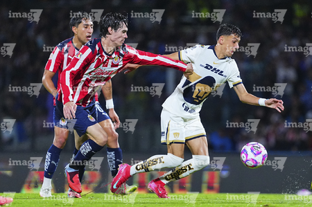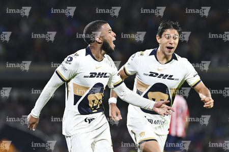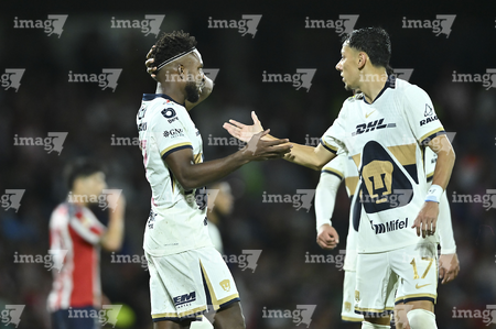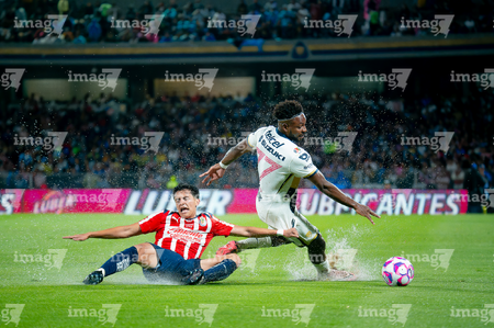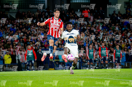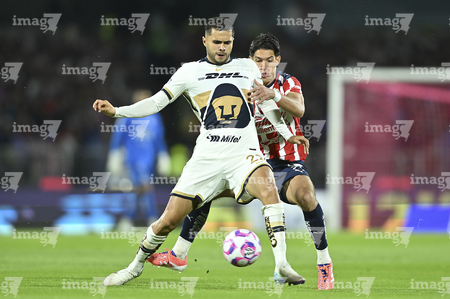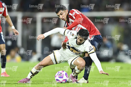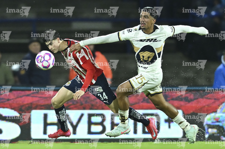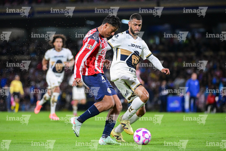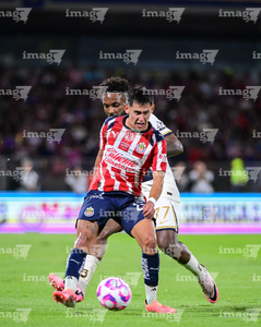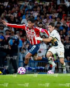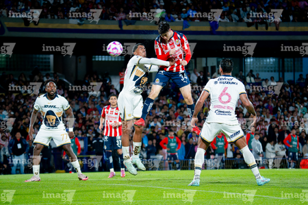 Ciudad de México, 5 de octubre de 2025. José Caicedo y , durante el partido correspondiente a la jornada 12 del torneo Apertura 2025 de la Liga BBVA MX, entre los Pumas de la UNAM y las Chivas Rayadas del Guadalajara, realizado en el estadio Olímpico Universitario. Foto: Imago7/ Manlio Contreras