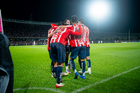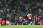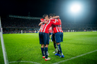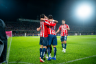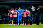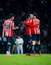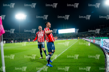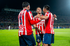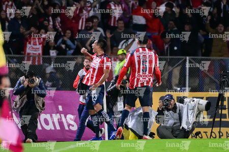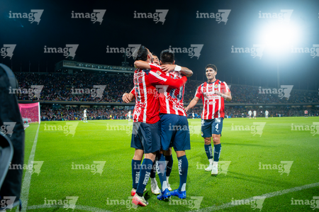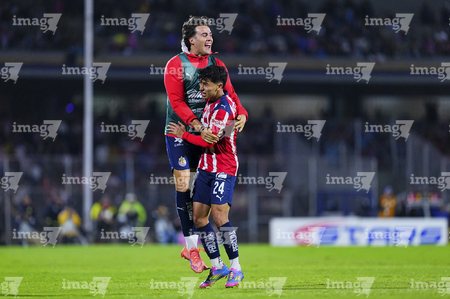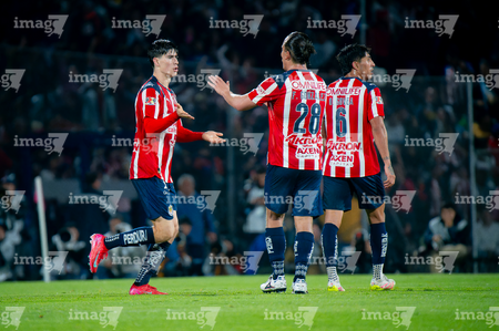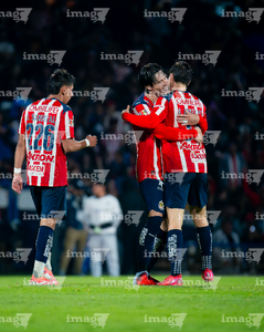 Ciudad de México, 5 de octubre de 2025. Jugadores de Chivas en festejo, durante el partido correspondiente a la jornada 12 del torneo Apertura 2025 de la Liga BBVA MX, entre los Pumas de la UNAM y las Chivas Rayadas del Guadalajara, realizado en el estadio Olímpico Universitario. Foto: Imago7/ Manlio Contreras