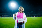 Ciudad de México, 5 de octubre de 2025. Embajadora por la Campaña Rosa contra el cáncer de mama, durante el partido correspondiente a la jornada 12 del torneo Apertura 2025 de la Liga BBVA MX, entre los Pumas de la UNAM y las Chivas Rayadas del Guadalajara, realizado en el estadio Olímpico Universitario. Foto: Imago7/ Diego Padilla