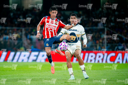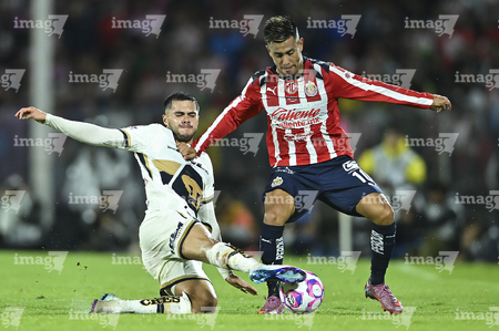 Ciudad de México, 5 de octubre de 2025. Richard Ledezma y Alvaro Angulo, durante el partido correspondiente a la jornada 12 del torneo Apertura 2025 de la Liga BBVA MX, entre los Pumas de la UNAM y las Chivas Rayadas del Guadalajara, realizado en el estadio Olímpico Universitario. Foto: Imago7/ Diego Padilla