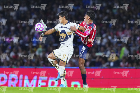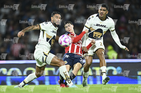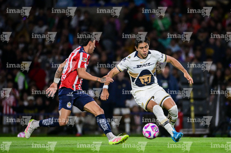 Ciudad de México, 5 de octubre de 2025. Armando González y Santiago Trigos, durante el partido correspondiente a la jornada 12 del torneo Apertura 2025 de la Liga BBVA MX, entre los Pumas de la UNAM y las Chivas Rayadas del Guadalajara, realizado en el estadio Olímpico Universitario. Foto: Imago7/ Alexis Chavez