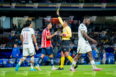 Ciudad de México, 5 de octubre de 2025. Jorge Ruvalcaba en reclamo, durante el partido correspondiente a la jornada 12 del torneo Apertura 2025 de la Liga BBVA MX, entre los Pumas de la UNAM y las Chivas Rayadas del Guadalajara, realizado en el estadio Olímpico Universitario. Foto: Imago7/ Manlio Contreras