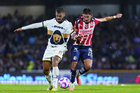 Ciudad de México, 5 de octubre de 2025. Armando González y Nathanael Ananias, durante el partido correspondiente a la jornada 12 del torneo Apertura 2025 de la Liga BBVA MX, entre los Pumas de la UNAM y las Chivas Rayadas del Guadalajara, realizado en el estadio Olímpico Universitario. Foto: Imago7/ Alexis Chavez