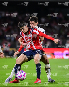 Ciudad de México, 5 de octubre de 2025. Alan Medina y Efraín Álvarez durante el partido correspondiente a la jornada 12 del torneo Apertura 2025 de la Liga BBVA MX, entre los Pumas de la UNAM y las Chivas Rayadas del Guadalajara, realizado en el estadio Olímpico Universitario. Foto: Imago7/ Etzel Espinosa