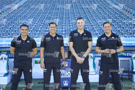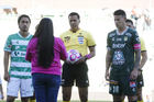 Torreón, Coahuila, 18 de octubre de 2025. Árbitros, durante el partido correspondiente a la jornada 13 del torneo Apertura 2025 de la Liga BBVA MX, entre los Guerreros de Santos Laguna y los Esmeraldas del León, realizado en el estadio Corona. Foto: Imago7/ Saul Perales