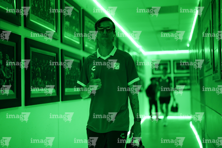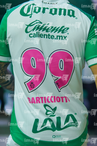 Torreón, Coahuila, 18 de octubre de 2025. Número de la Campaña Rosa para la concientización del Cáncer de Mama en el uniforme de Bruno Barticciotto, durante el partido correspondiente a la jornada 13 del torneo Apertura 2025 de la Liga BBVA MX, entre los Guerreros de Santos Laguna y los Esmeraldas del León, realizado en el estadio Corona. Foto: Imago7 Erick Saavedra