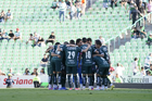 Torreón, Coahuila, 18 de octubre de 2025. Jugadores del Santos Laguna en festejo de gol, durante el partido correspondiente a la jornada 13 del torneo Apertura 2025 de la Liga BBVA MX, entre los Guerreros de Santos Laguna y los Esmeraldas del León, realizado en el estadio Corona. Foto: Imago7/ Saul Perales